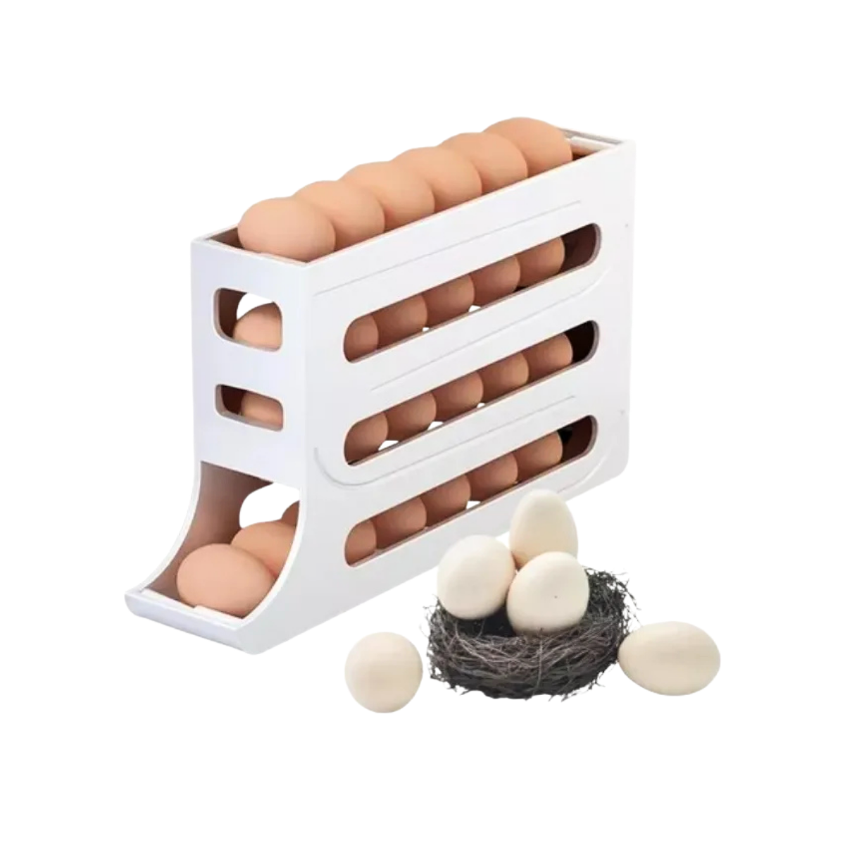 Optimiza el almacenamiento y la exhibición de huevos con esta caja de dispensadores apilables, ideal para negocios que buscan ofrecer un producto práctico, funcional y de alta rotación. Cada dispensador cuenta con capacidad para 30 huevos, ayudando a mantenerlos ordenados, protegidos y visibles en el refrigerador.