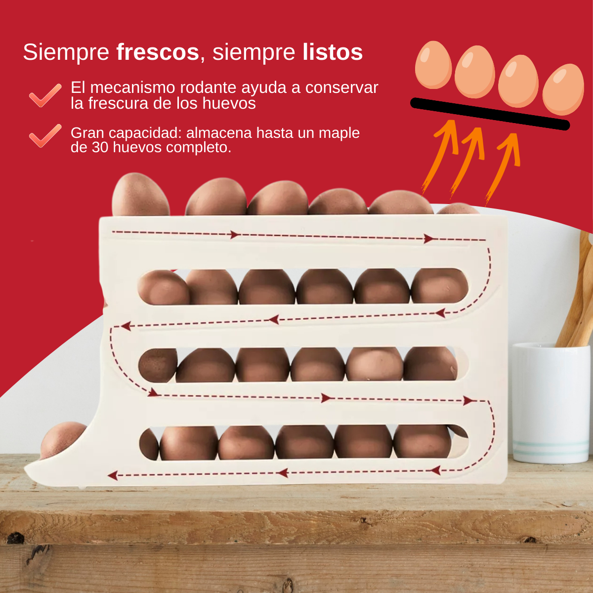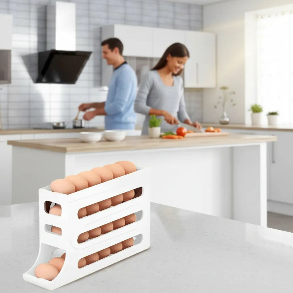 Es ideal para refrigeradores, cocinas modernas y despensas, manteniendo los huevos visibles, protegidos y organizados.
