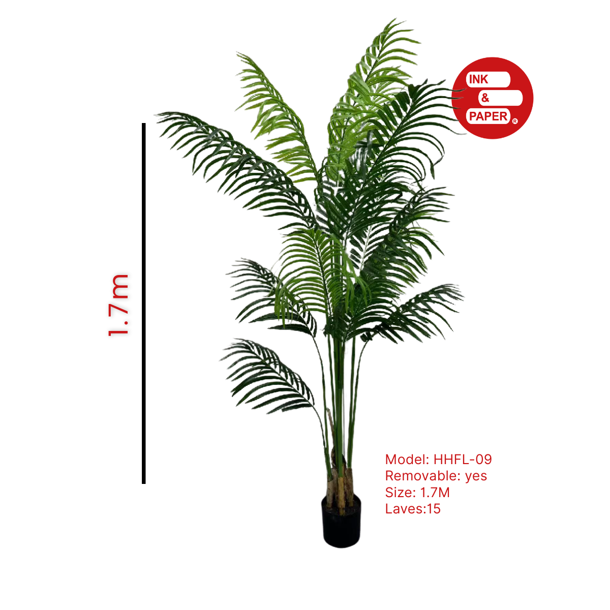 Sus hojas finas y abundantes recrean fielmente la palmera natural, convirtiéndola en una excelente opción decorativa para hogares, oficinas, locales comerciales, hoteles, recepciones y ambientes interiores modernos. Incluye base original de plástico color negro, ideal para usar directamente o para colocar dentro de un macetero decorativo adicional.